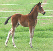Seeland (Schweiz) 26. August 2005 - Nachdem Kamee v. Summertime a.d. Pr. St. Karma lV v. Benz am 20. August Gesamtsiegerin der Trakehnerfohlenmusterung in der Schweiz geworden ist (WN 8.5/8.5/7.5/8.5/8.5/7/8.5) ist sie am 26. August bei der Fohlenmusterung der Pferdezuchtgenossenschaft Seeland (Schweizer Musterung) 5. von 50 Fohlen geworden. Sie bekam die WN 8/8/8 bei einer möglichen Höchstnote von 9. Damit hat sie sich für das Schweizer Fohlenchampionat am 17. September im Nationalen Gestüt in Avenches qualifiziert. Dort werden sich alle Fohlen aus der Schweiz messen, die in der Bewertung 24 und mehr Punkte erreicht haben. Es ist schon als eine kleine Sensation zu bezeichnen, dass sich ein rein gezogenes Trakehnerfohlen unter die besten der „Schweizer Pferde“ einreihen kann. (C.Gaudy) |